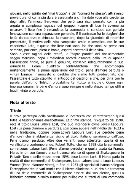 nella tradizione, oppure come Love’s Labours Lost (Le perdute pene