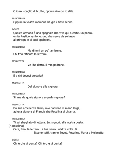 Escono tutti, tranne Boyet, Rosalina, Maria e Melacotta.