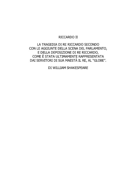 RICCARDO II LA TRAGEDIA DI RE RICCARDO SECONDO CON LE AGGIUNTE DELLA SCENA DEL PARLAMENTO, E DELLA DEPOSIZIONE DI RE RICCARDO, COME È STATA ULTIMAMENTE RAPPRESENTATA DAI SERVITORI DI SUA MAESTÀ IL RE, AL “GLOBE”. DI WILLIAM SHAKESPEARE