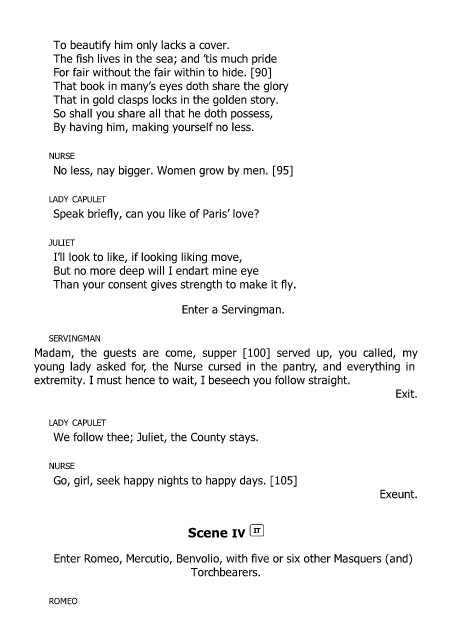 Enter Romeo, Mercutio, Benvolio, with five or six other Masquers (and)