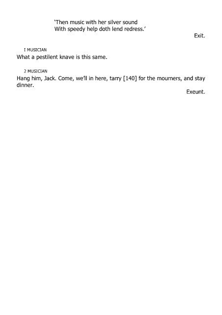 ‘Then music with her silver sound With speedy help doth lend redress.’ Exit. I MUSICIAN What a pestilent knave is this same. 2 MUSICIAN Hang him, Jack. Come, we’ll in here, tarry [140] for the mourners, and stay dinner. Exeunt.
